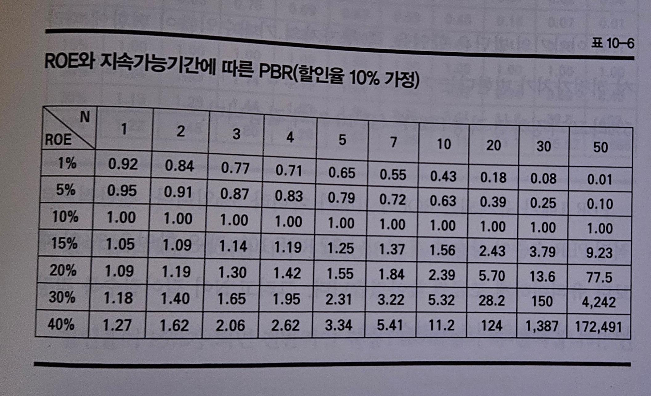 할인율을 10% 기준으로 정하고 해당 기업의 ROE와 그것의 지속기간을 추정해보면서